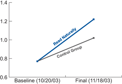 The results indicated that the Read Naturally group increased their fluency and comprehension scores considerably more than the control group, as shown in the tables and graphs below.