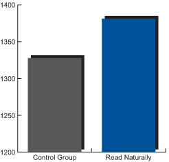 A comparison of 44 matched pairs of students with MCA scores in grades 3 and 5 showed that students in the Read Naturally program scored significantly higher than the control group. Specifically, the average score for the Read Naturally students was 1380.9 compared to an average score of 1327.6 for the control group (see the following chart).